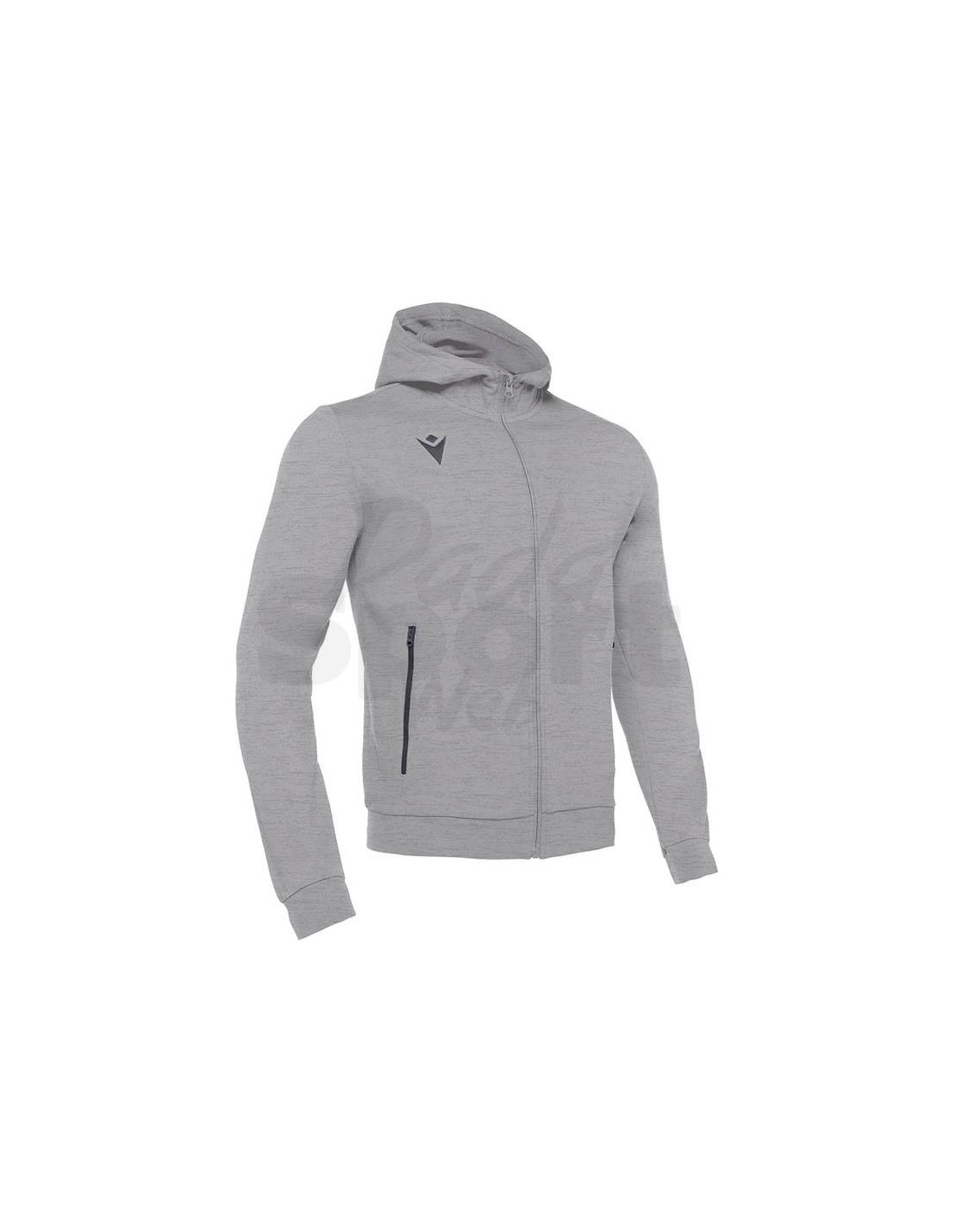 CELLO è la felpa Macron con cappuccio sfoderato, zip intera rovesciata, due tasche con zip rovesciata in contrasto, polsi e fascione in costina, realizzata in morbido cotone felpato.
