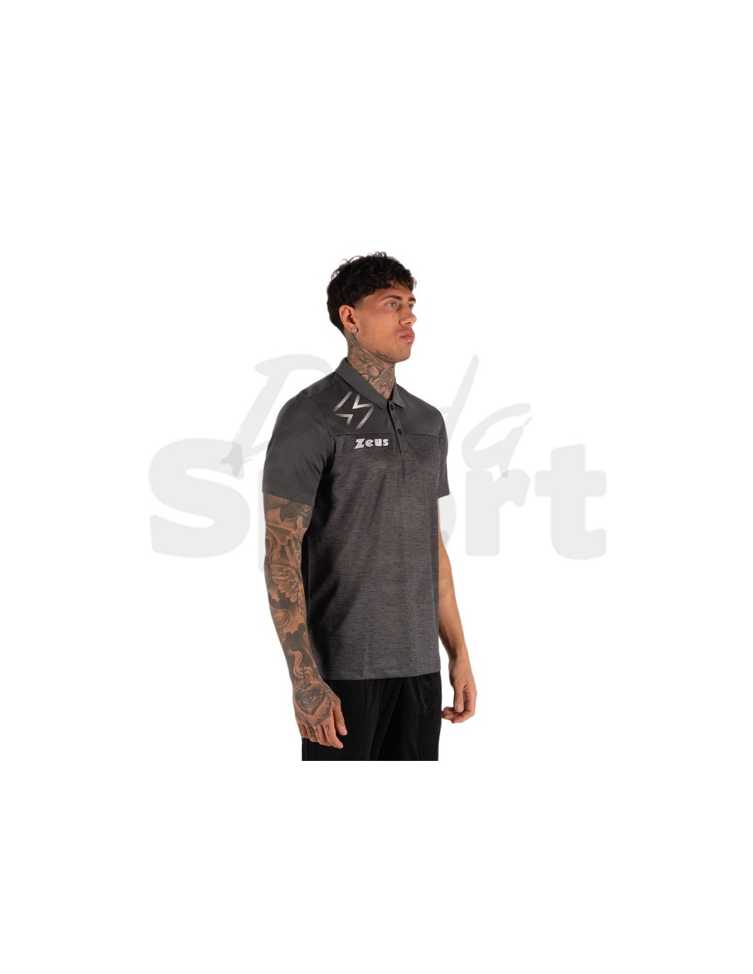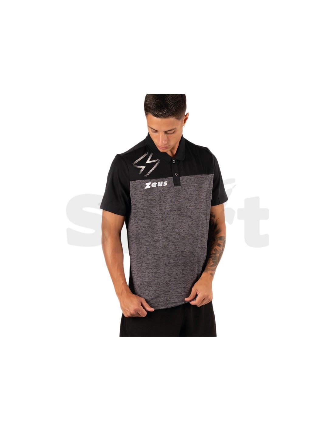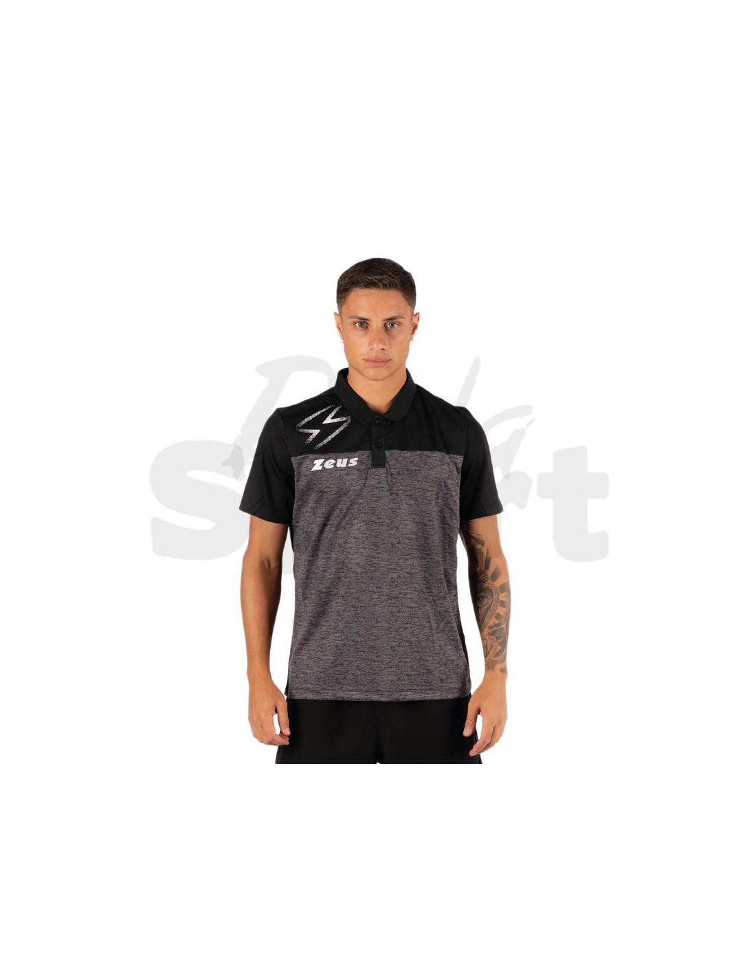 Polo sportiva unisex Zeus Olympia. Tessuto 100% poliestere con design a doppia trama: pannello superiore a contrasto sulle spalle e grafica a fulmine in stampa bianca. Colletto classico a camicia con chiusura a bottoni, logo Zeus stampato sul petto. Vestibilità standard fit. Ideale per il tempo libero e la rappresentanza squadra.