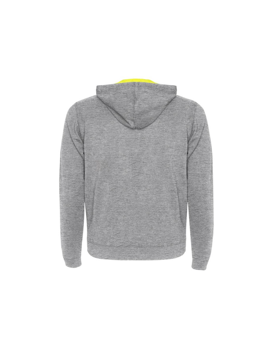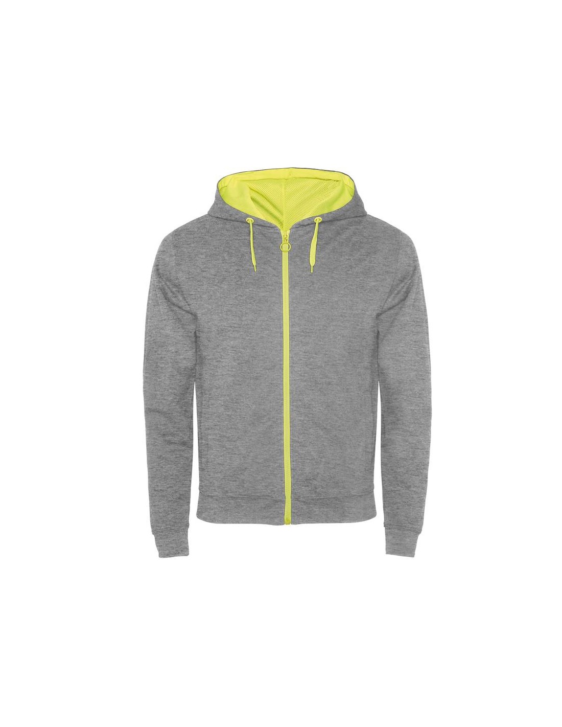 Cappuccio con fodera in tessuto poliestere microforato a contrasto colore fluo, coulisse e occhielli in metallo a contrasto colore fluo.
