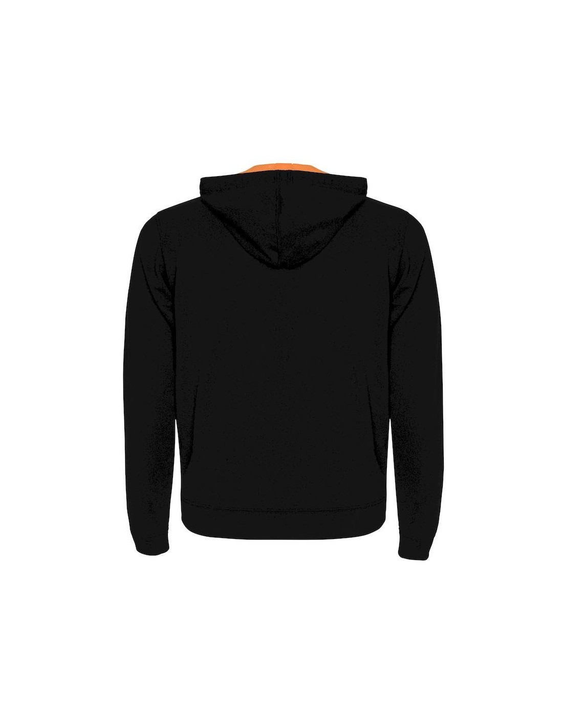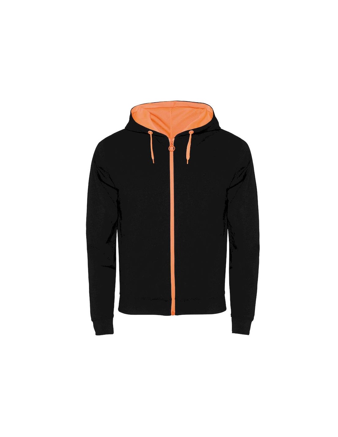 Cappuccio con fodera in tessuto poliestere microforato a contrasto colore fluo, coulisse e occhielli in metallo a contrasto colore fluo.