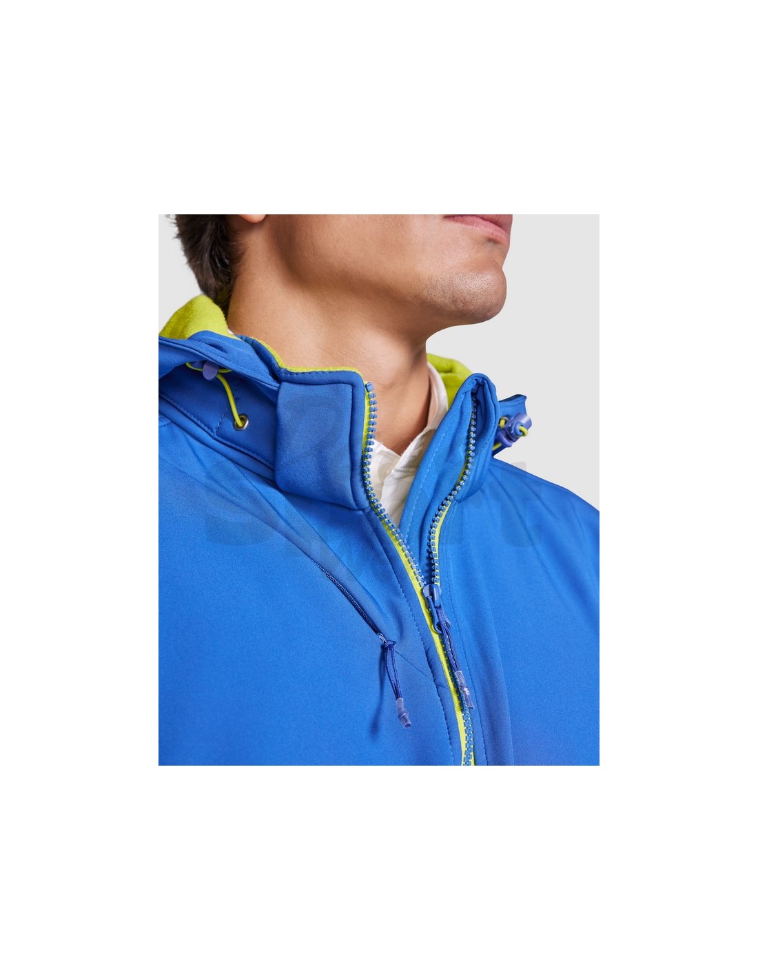 Softshell a 2 strati in stile sportivo, cerniera centrale iniettata a contrasto con protezione per il mento e tiretto, interno caldo in micropile a contrasto, due tasche laterali e una tasca sul petto con cerniera invisibile e tiretto, piccola tasca sulla manica sinistra, polsini e girovita elasticizzati, cappuccio rimovibile con fodera a contrasto in micropile.