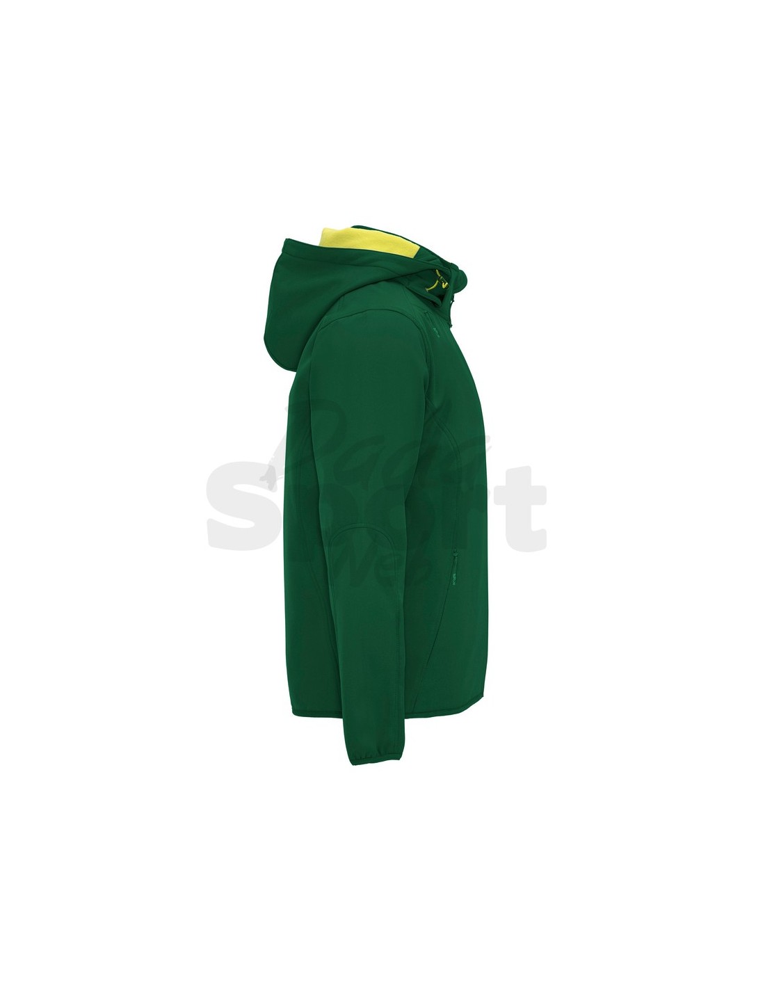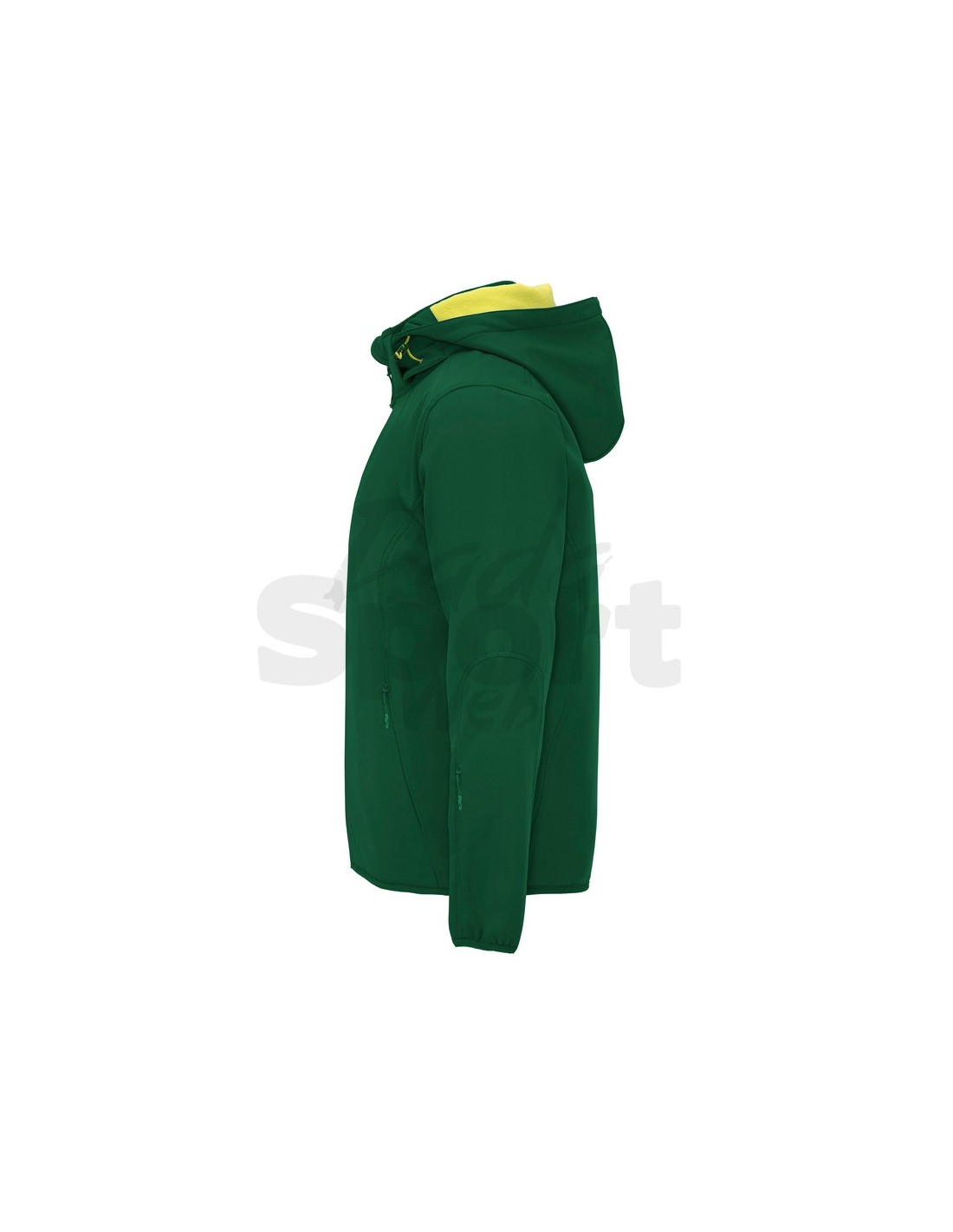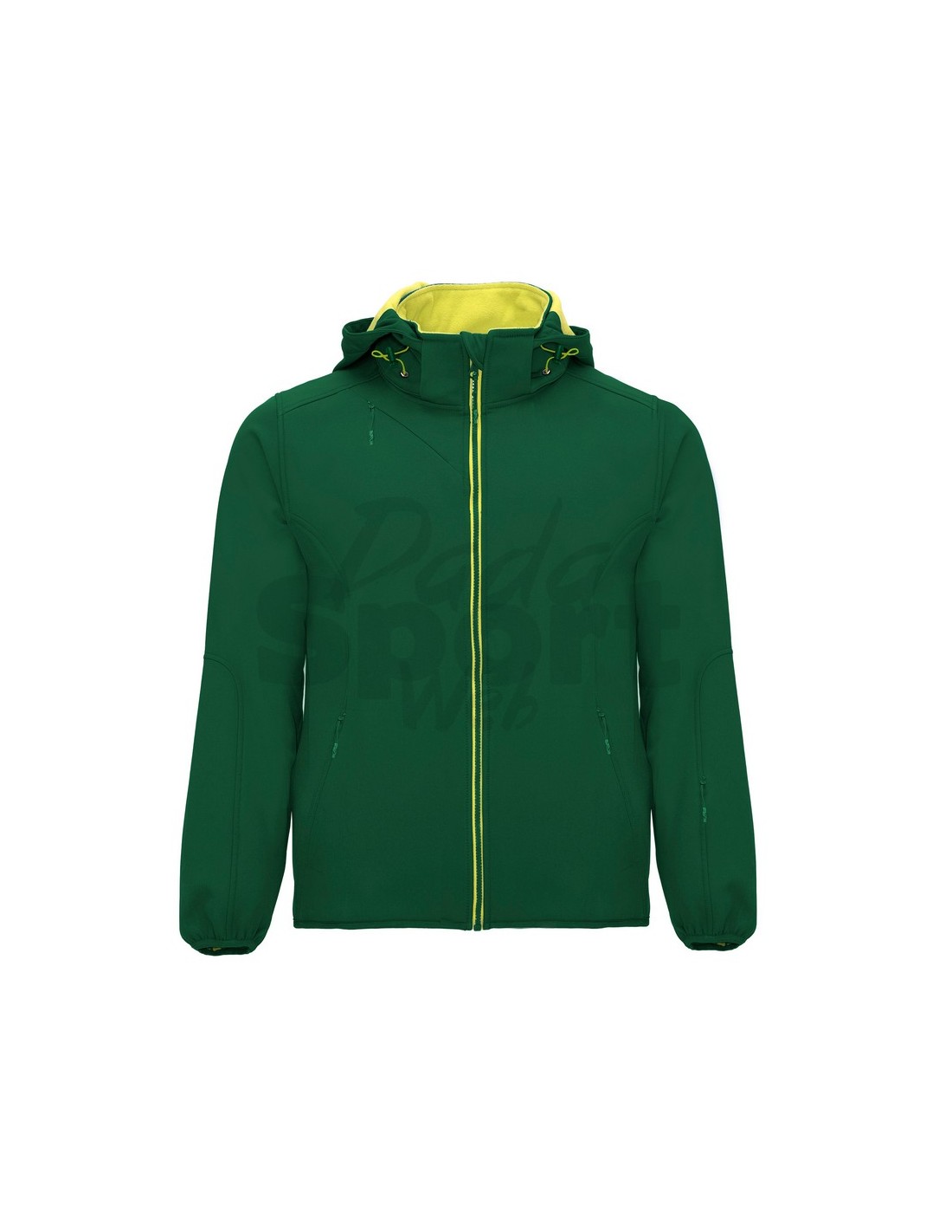 Softshell a 2 strati in stile sportivo, cerniera centrale iniettata a contrasto con protezione per il mento e tiretto, interno caldo in micropile a contrasto, due tasche laterali e una tasca sul petto con cerniera invisibile e tiretto, piccola tasca sulla manica sinistra, polsini e girovita elasticizzati, cappuccio rimovibile con fodera a contrasto in micropile.
