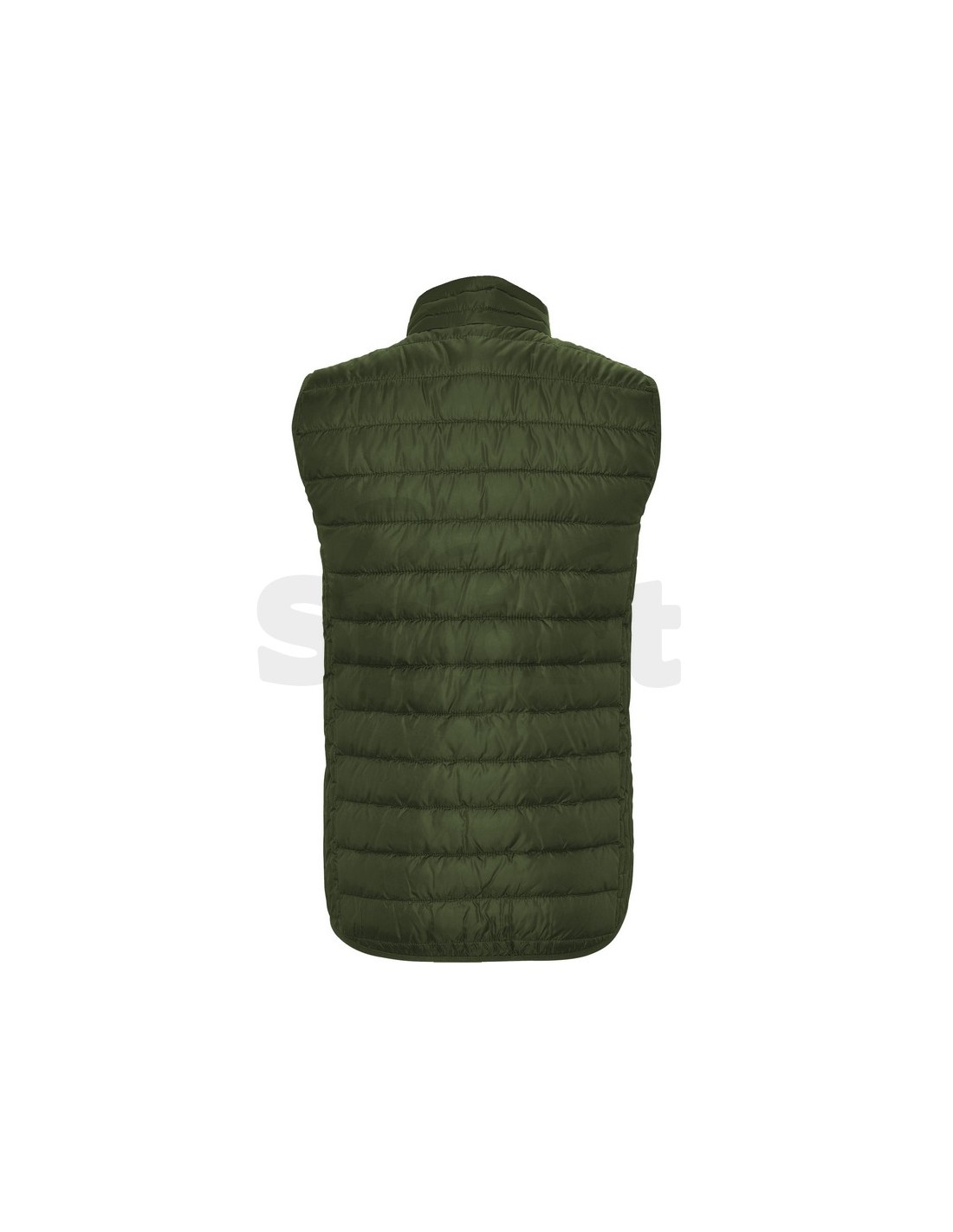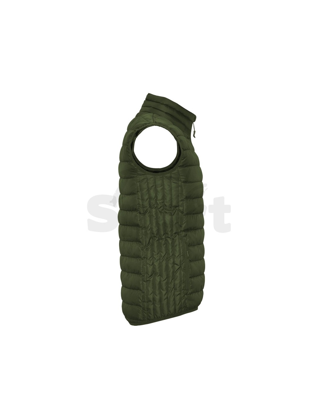 Gilet imbottito idrorepellente, zip frontale invertita tono su tono con protezione per il mento in tessuto uguale, tasche laterali con zip tono su tono inserite nei pannelli laterali, piping elastico invertito tono su tono su giromanica e orlo.