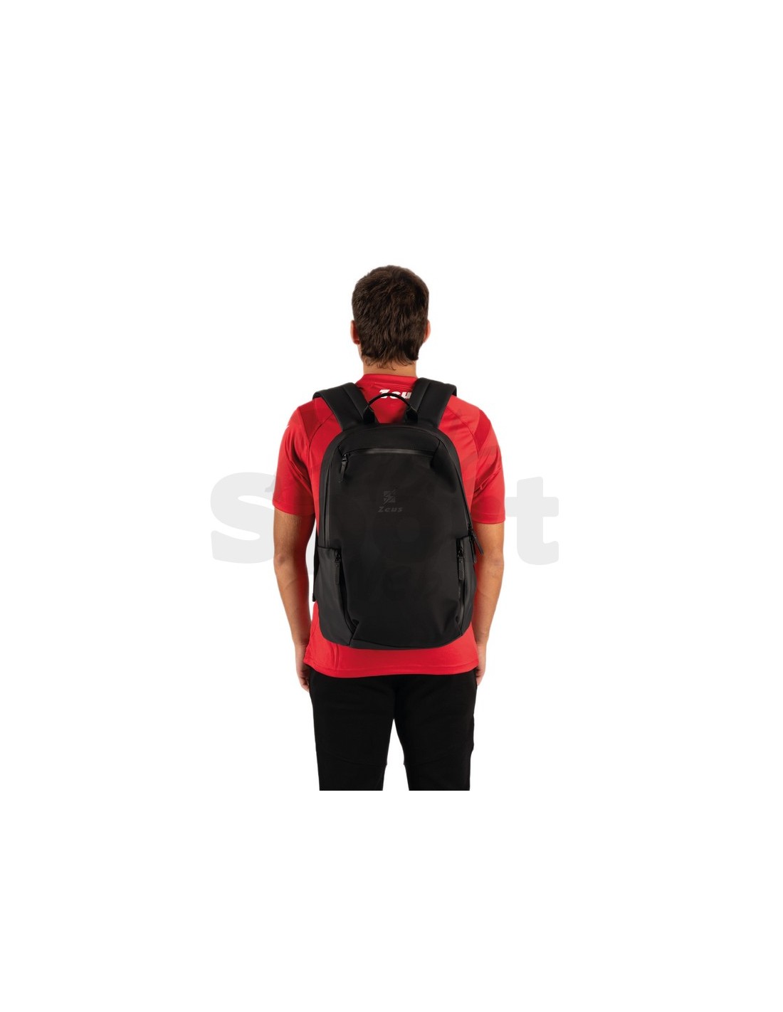 Zaino in Poliestere, tasche con zip e custodia interna per cellulare, connettore USB con cavo, tasche interne e scompartimento per PC, logo Zeus in embossed.