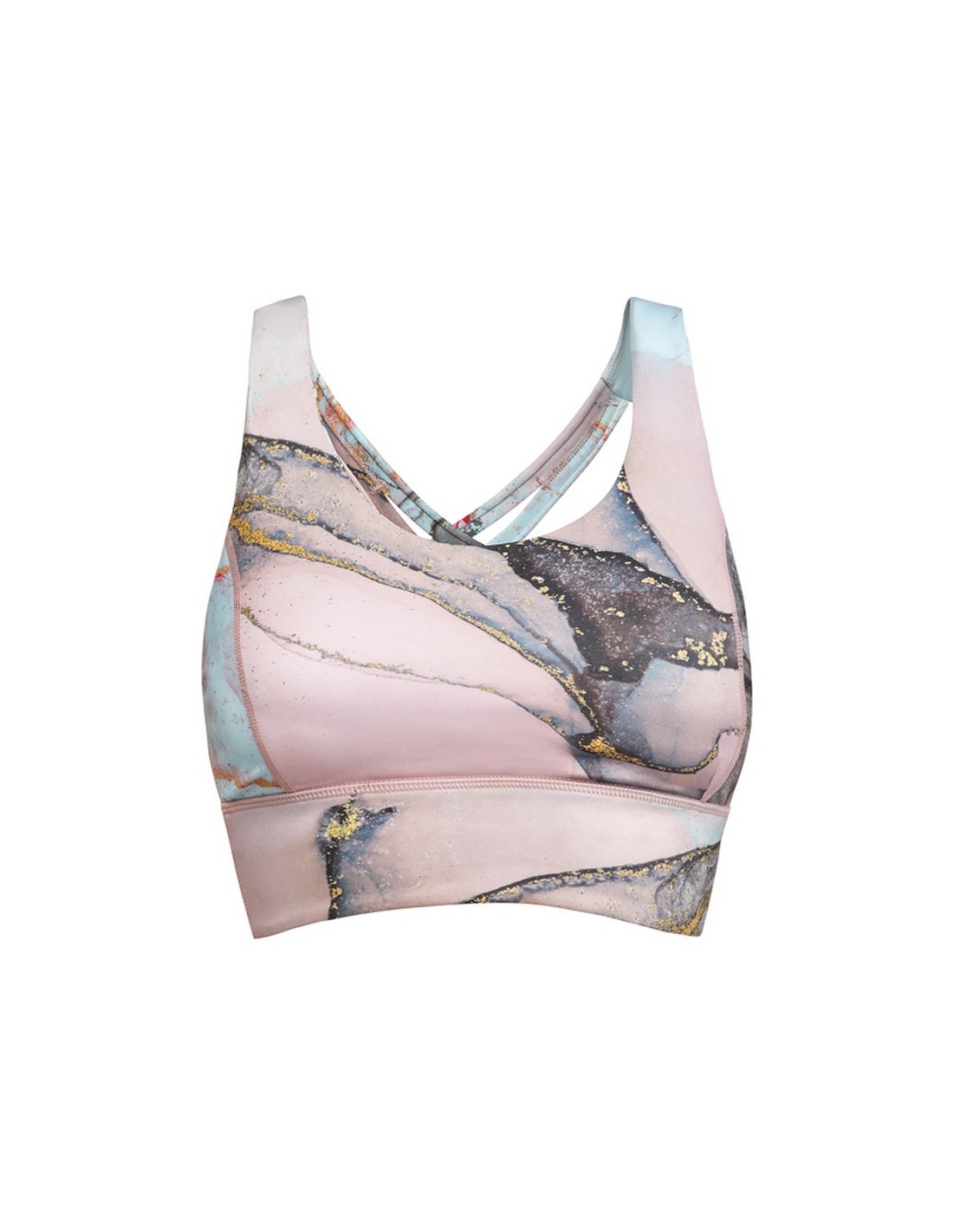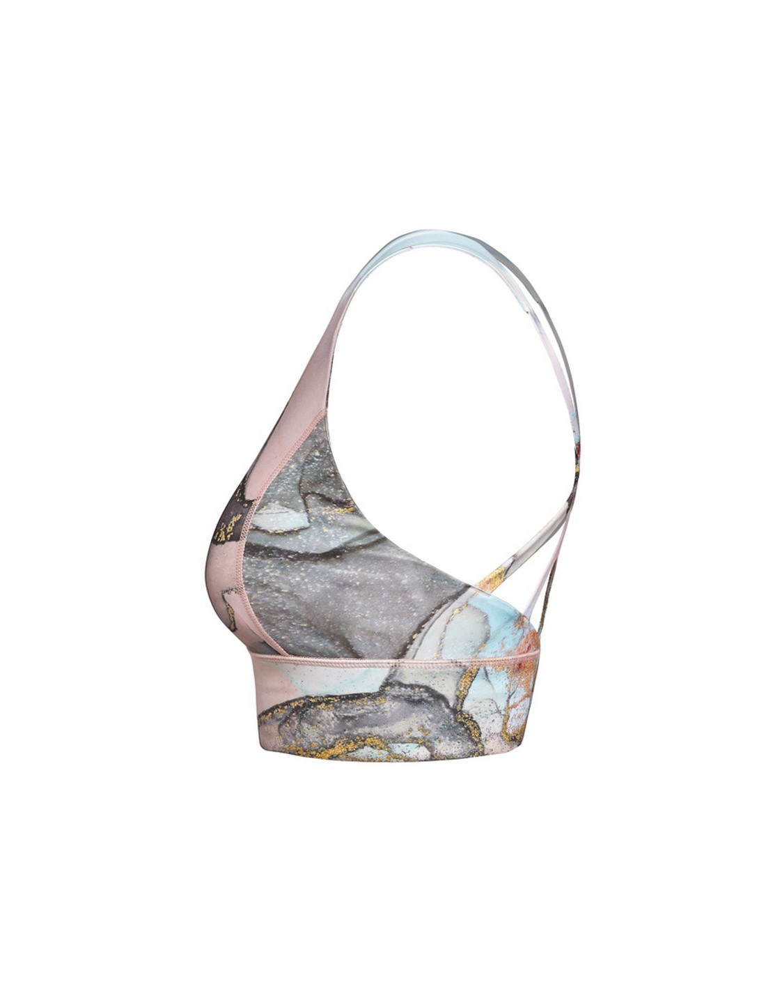 Top sportivo ad alto sostegno. Cinghie posteriori intrecciate. Banda elastica di rinforzo fascia di rinforzo sotto il petto. Tessuto doppio e foderato. Coppe in schiuma rimovibili. Logo Roly riflettente sul retro.