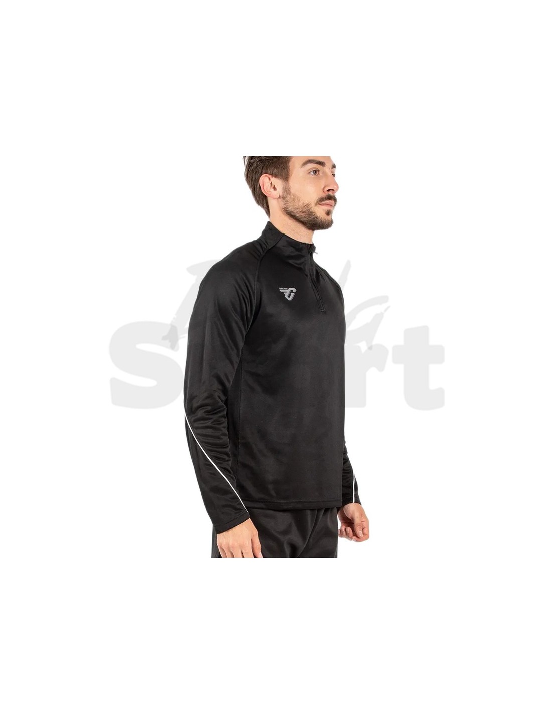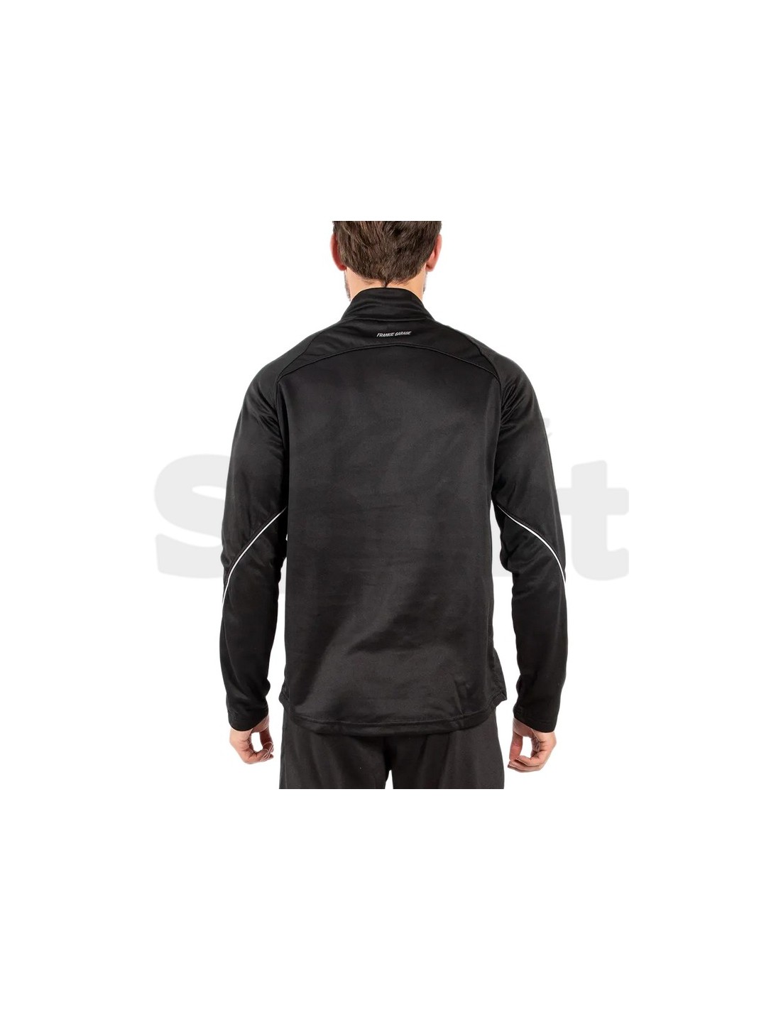 Il collo alto con mezza zip metallica è il cuore funzionale del capo: chiusa protegge dalla temperatura durante il riscaldamento, aperta gestisce la termoregolazione nelle fasi più intense.