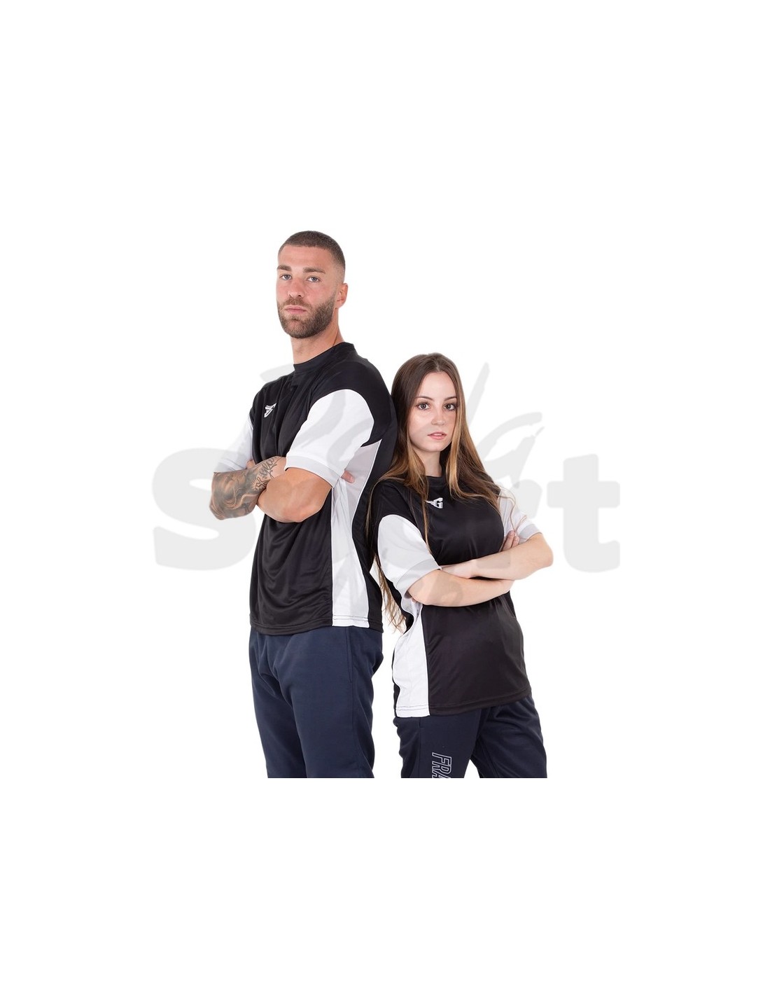 Maglia calcio Frankie Garage Hero 07 unisex, colore nero grigio. Tessuto Interlock e mesh 100% poliestere, leggera e resistente. Girocollo in tessuto coordinato, maniche raglan, piping a contrasto e logo in stampa gommata. Vestibilità semifitted, ideale per gare e allenamenti.