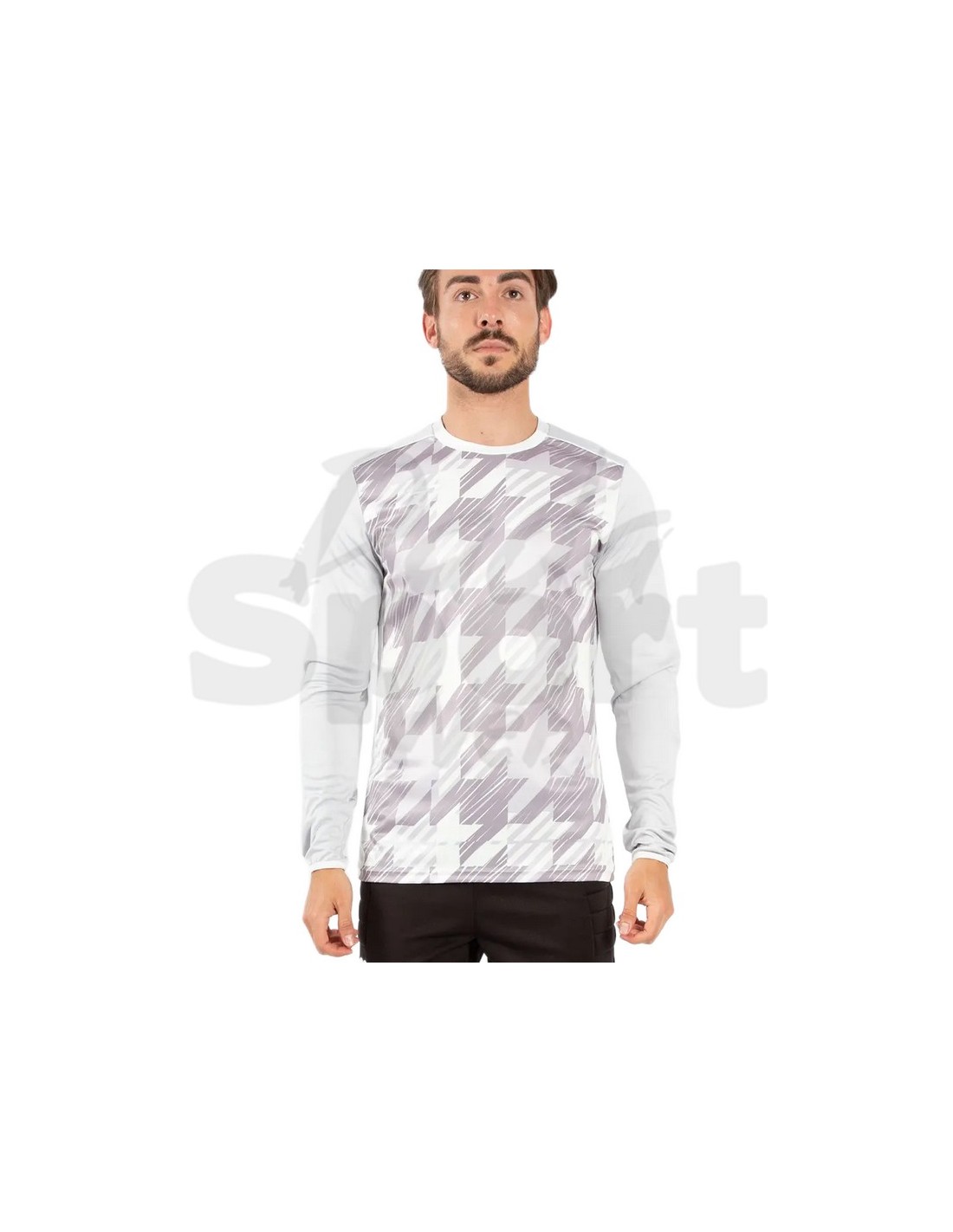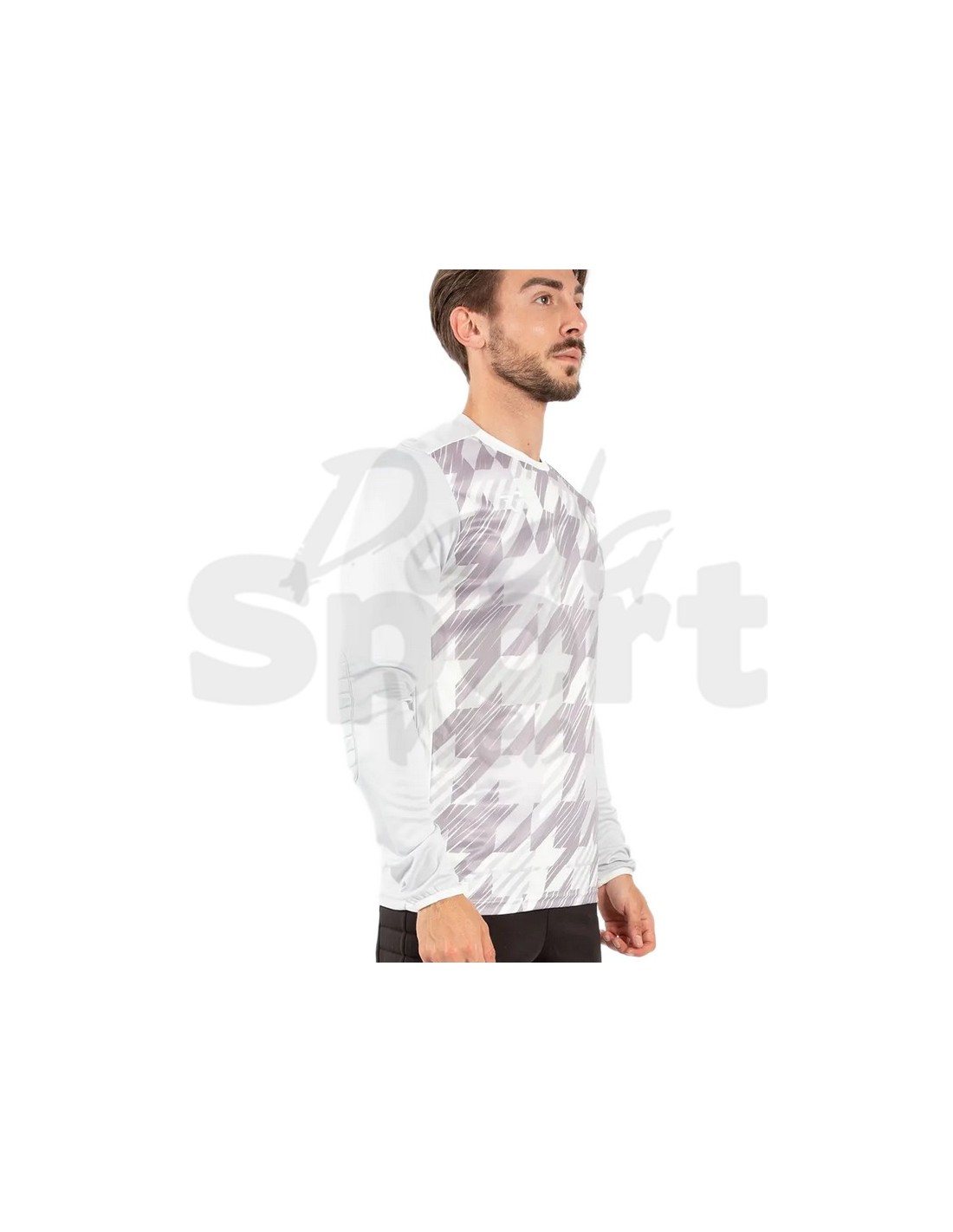 Maglia da portiere Frankie Garage Victory colore Grigio, manica lunga. Tessuto interlock resistente agli urti e agli strappi con imbottitura protettiva sui gomiti. Corpo anteriore con pattern pied-de-poule geometrico oversize in sublimazione, maniche tinta unita grigio. Girocollo bianco a contrasto. Logo FG sul petto. Semi fitted. Per allenamento e gara.
