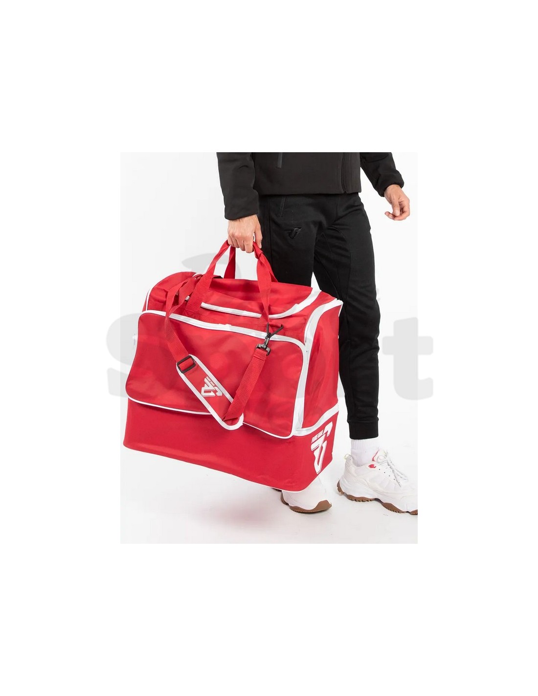 Il fondo rigido separato è la caratteristica tecnica che la distingue da una borsa sportiva convenzionale: uno scomparto inferiore autonomo con chiusura a zip orizzontale che isola le scarpe da calcio o gli indumenti bagnati dal resto del contenuto.