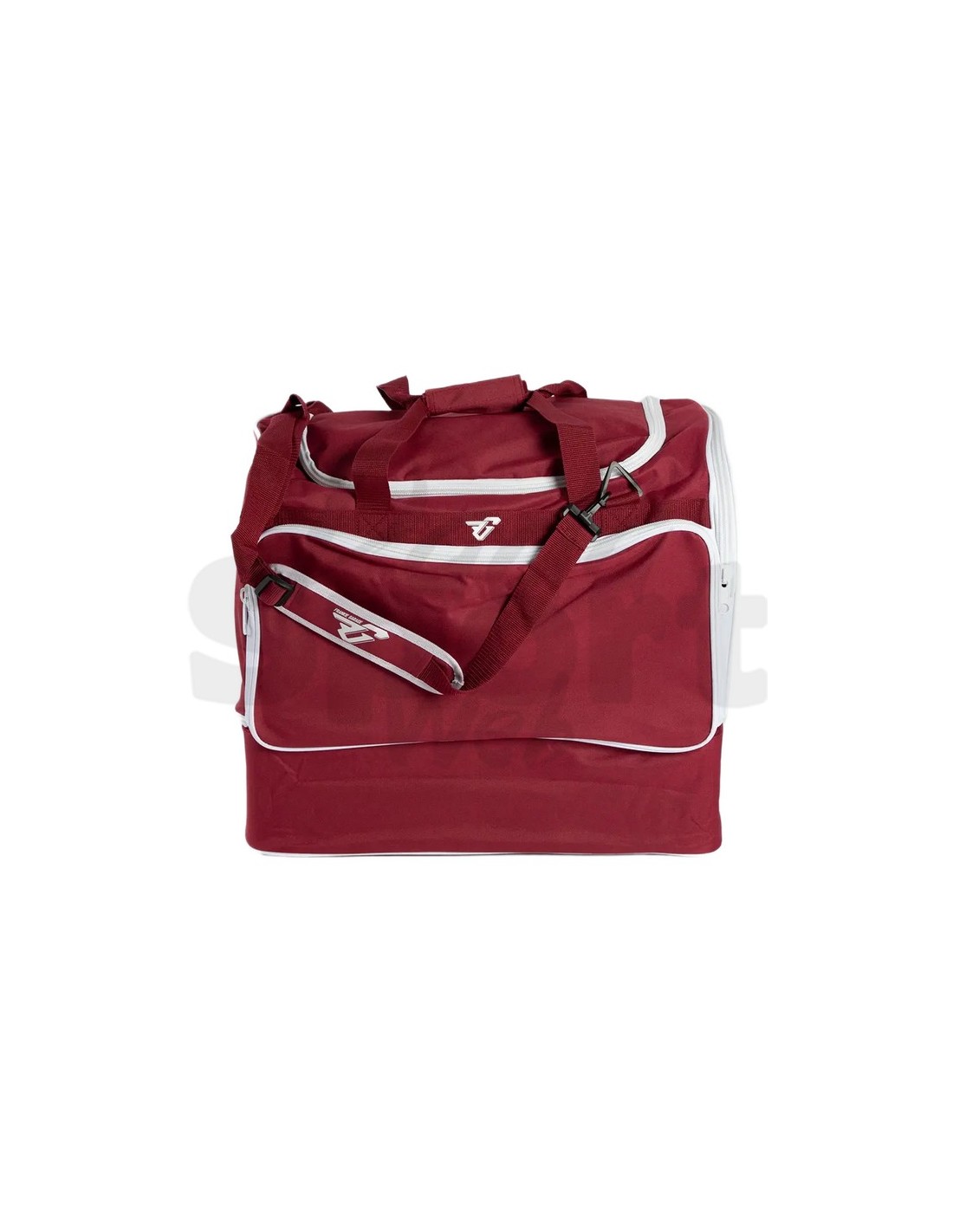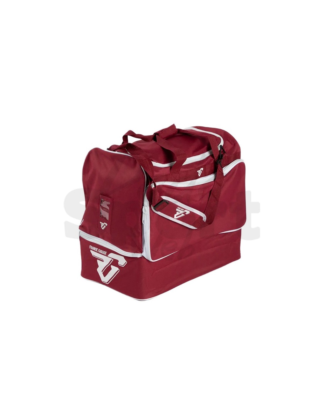 Borsa sportiva da allenamento Frankie Garage Torpedo 10 colore Granata/Bianco. 100% poliestere con fondo rigido separato, tasca frontale con zip curvilinea, tasche laterali con zip e tracolla regolabile. Logo FG ricamato sul frontale. Disponibile nelle taglie Senior e Junior.