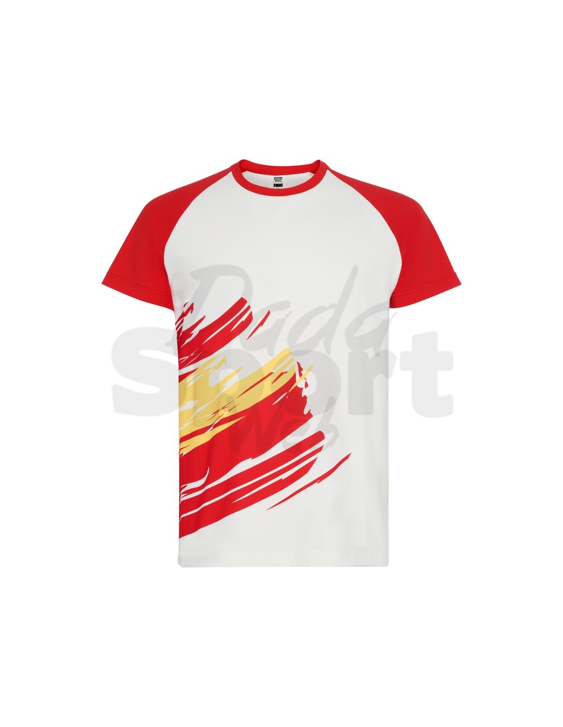 T-shirt tecnica Roly Forza Spagna in 100% poliestere 190 g/m con effetto cotone. Corpo bianco con maniche raglan a contrasto e stampa in sublimazione a pennellate dinamiche nei colori della nazione. Girocollo in tinta con le maniche, scollo nastrato. Personalizzabile con nome, numero e logo. Perfetta per tornei, tifo e gare di calcio e calcetto. Disponibile nelle varianti: Spagna, Francia, Italia, Portogallo, Germania.