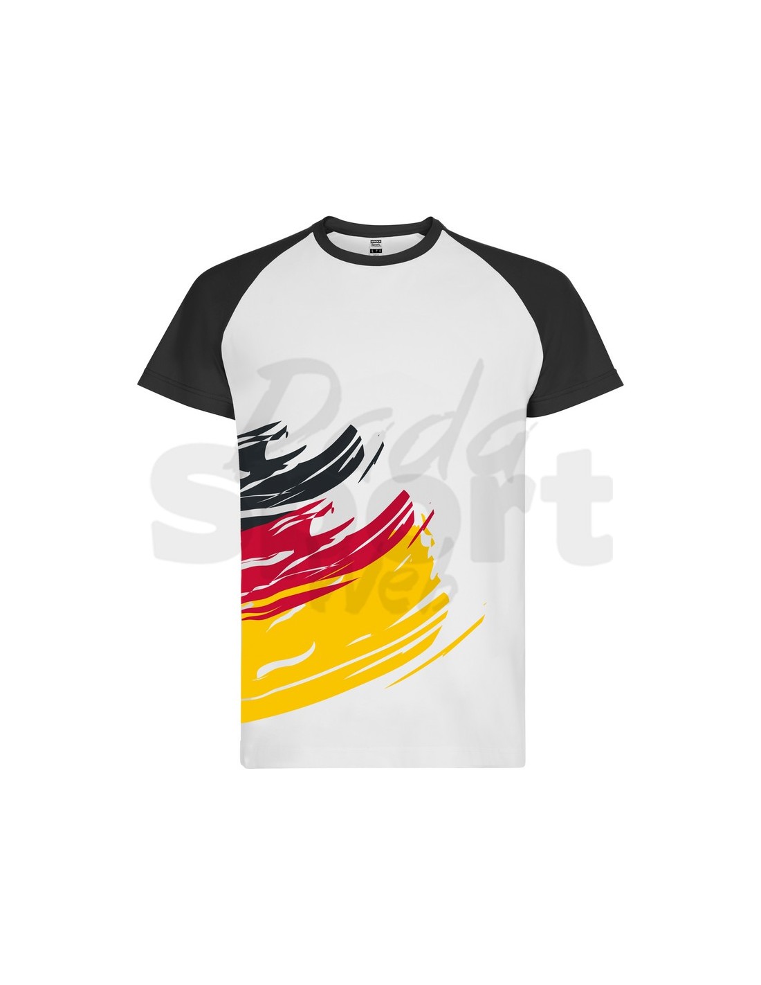 T-shirt tecnica Roly Forza Germania in 100% poliestere 190 g/m con effetto cotone. Corpo bianco con maniche raglan a contrasto e stampa in sublimazione a pennellate dinamiche nei colori della nazione. Girocollo in tinta con le maniche, scollo nastrato. Personalizzabile con nome, numero e logo. Perfetta per tornei, tifo e gare di calcio e calcetto. Disponibile nelle varianti: Spagna, Francia, Italia, Portogallo, Germania.
