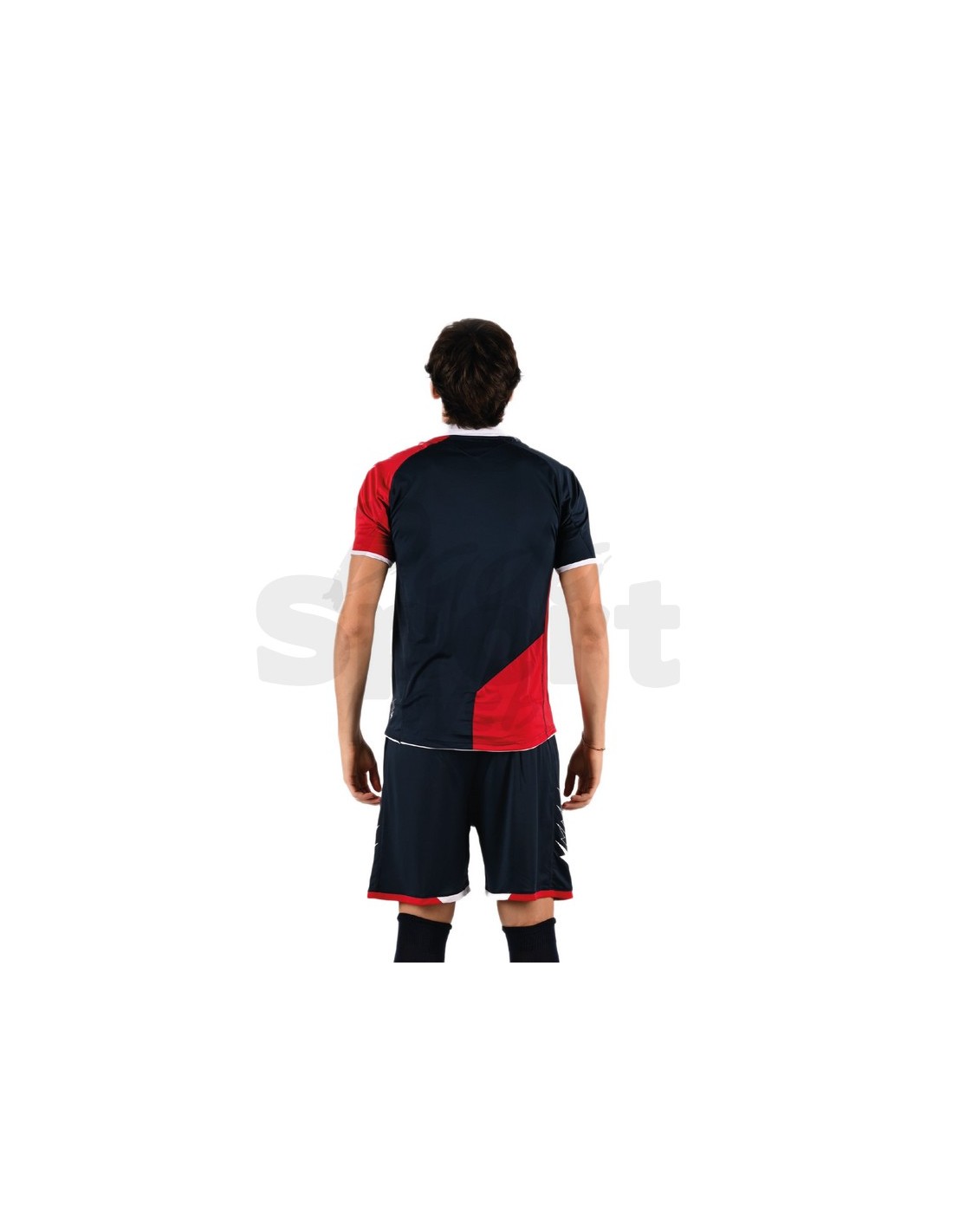 La maglia della divisa hadue fascie verticali di colore diverso con stampa sublimatica, scollo a V e colletto dello stesso colore dell'orlo delle maniche. I Pantaloncini Calcio hanno disegno laterale e logo stampato.