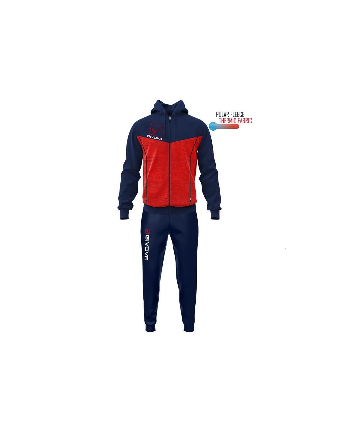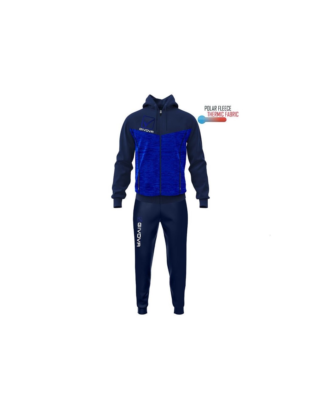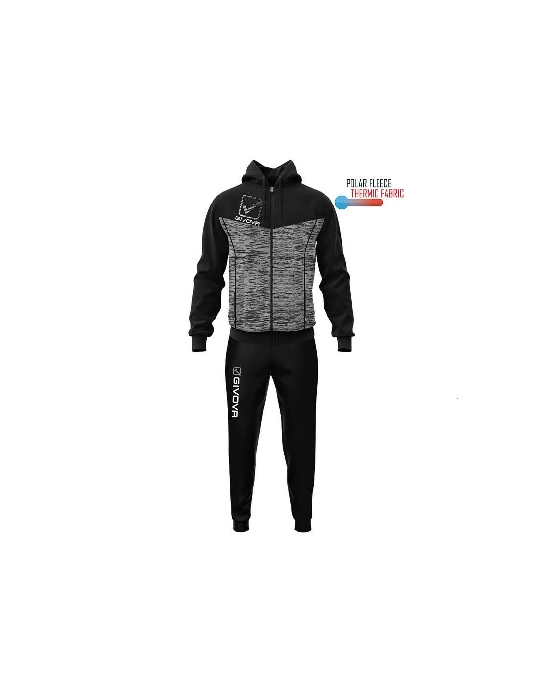 Questa tuta ha giacca con cappuccio e tasche con zip,polsini e fondo in costina, loghi stampati, mentre il pantalone ha sempre le tasche laterali ma senza zip, fondo gamba con polsino elastico in costina, logo givova su gamba destra stampato.
