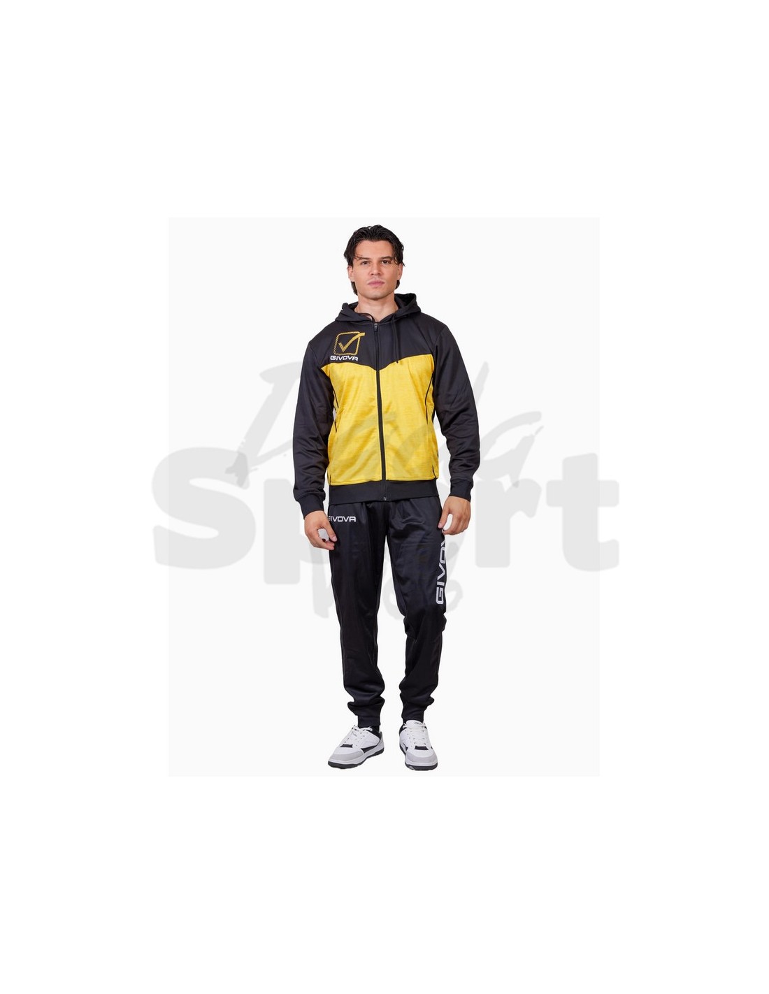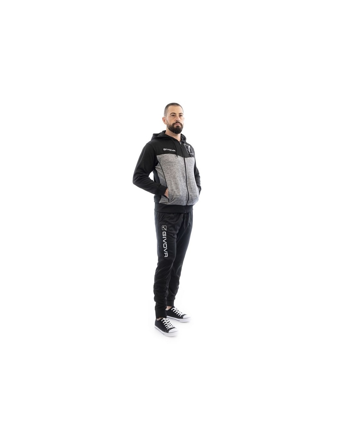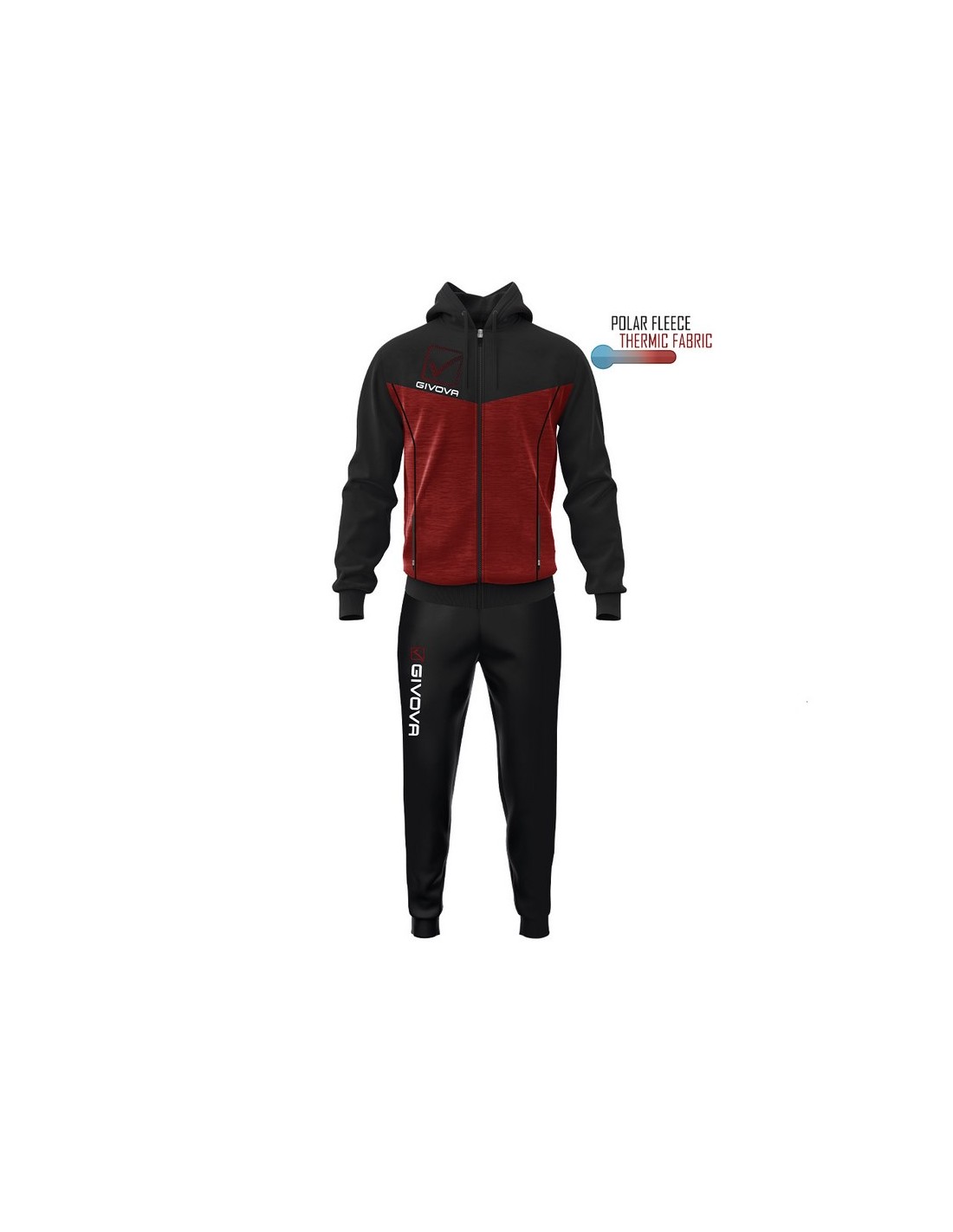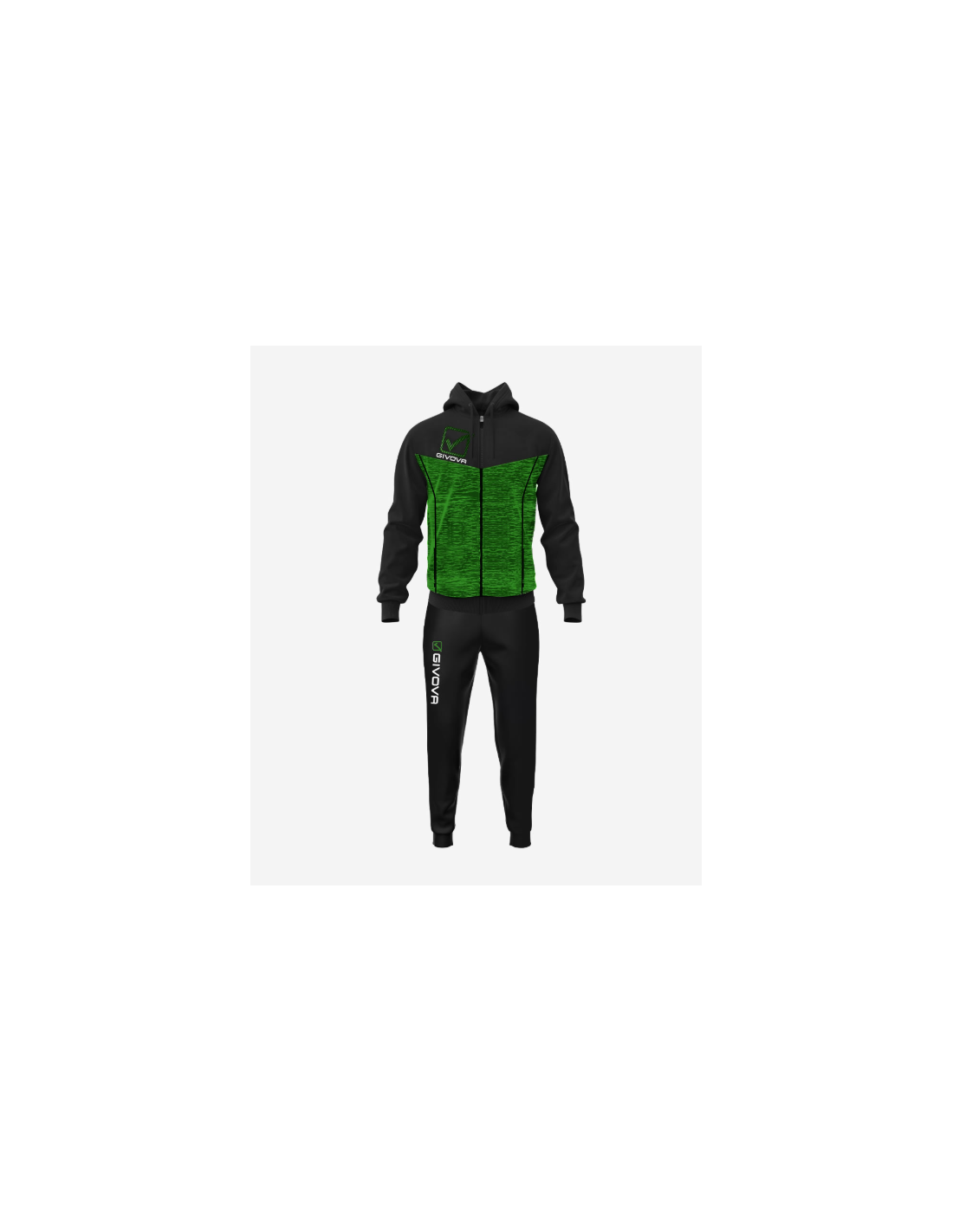Questa tuta ha giacca con cappuccio e tasche con zip,polsini e fondo in costina, loghi stampati, mentre il pantalone ha sempre le tasche laterali ma senza zip, fondo gamba con polsino elastico in costina, logo givova su gamba destra stampato.