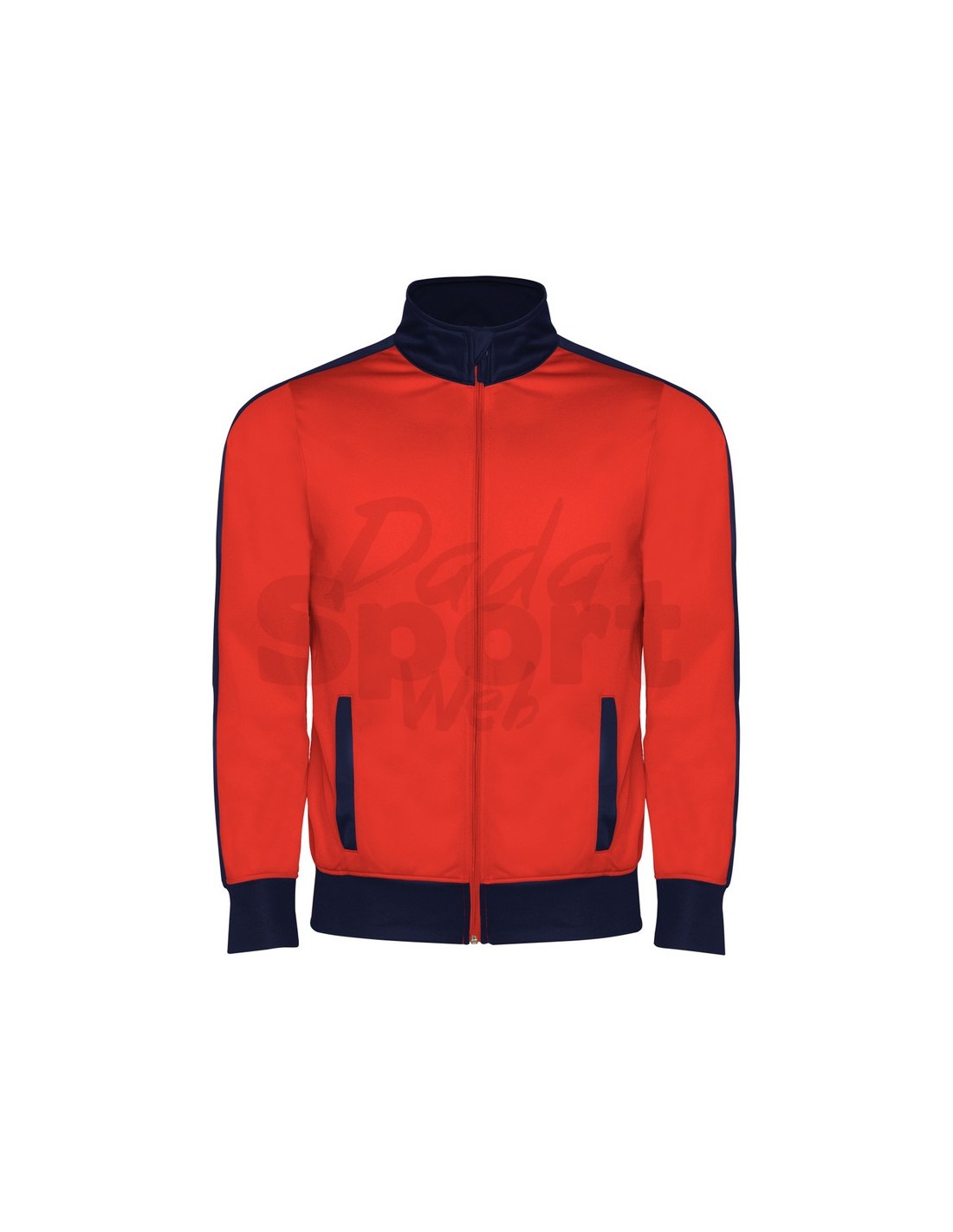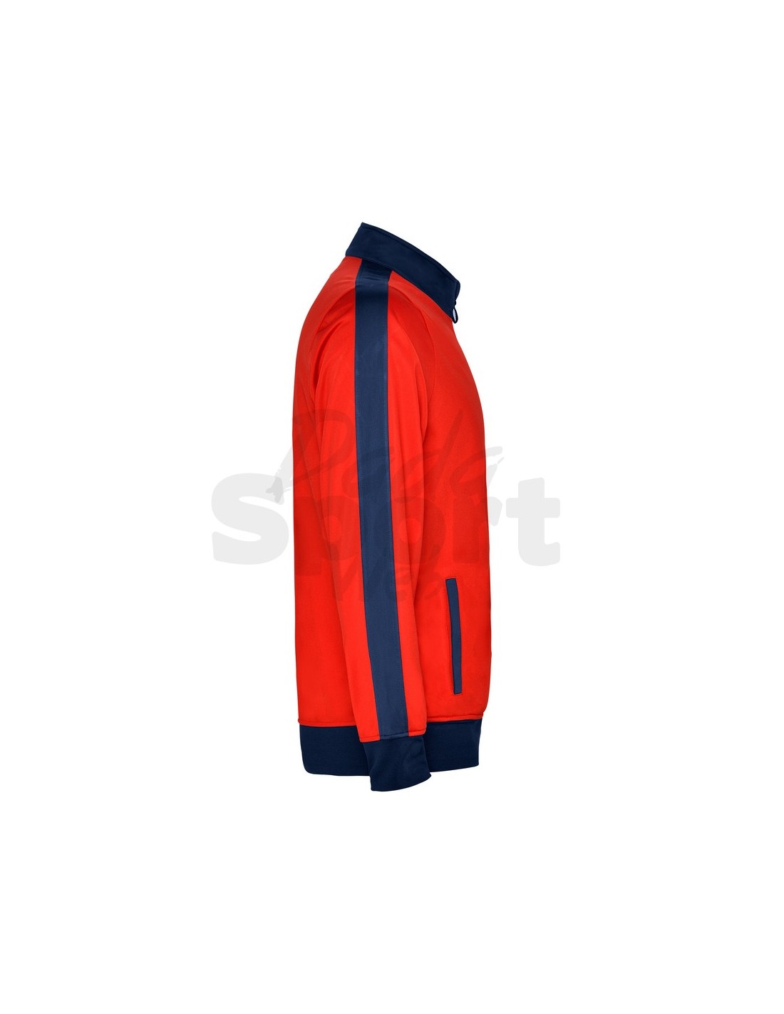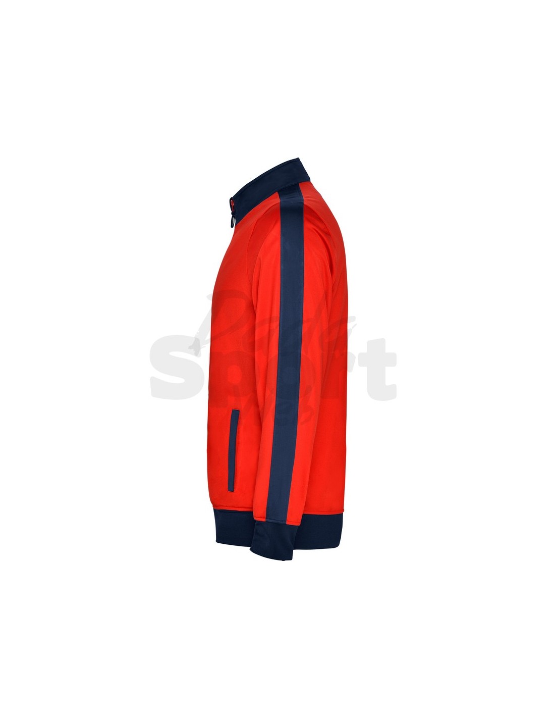 La giacca ha il collo alto con protezione zip, tasche frontali in colore a contrasto, polsini e vita in costina 1x1 in colore a contrasto, zip centrale con copri cuciture interne.