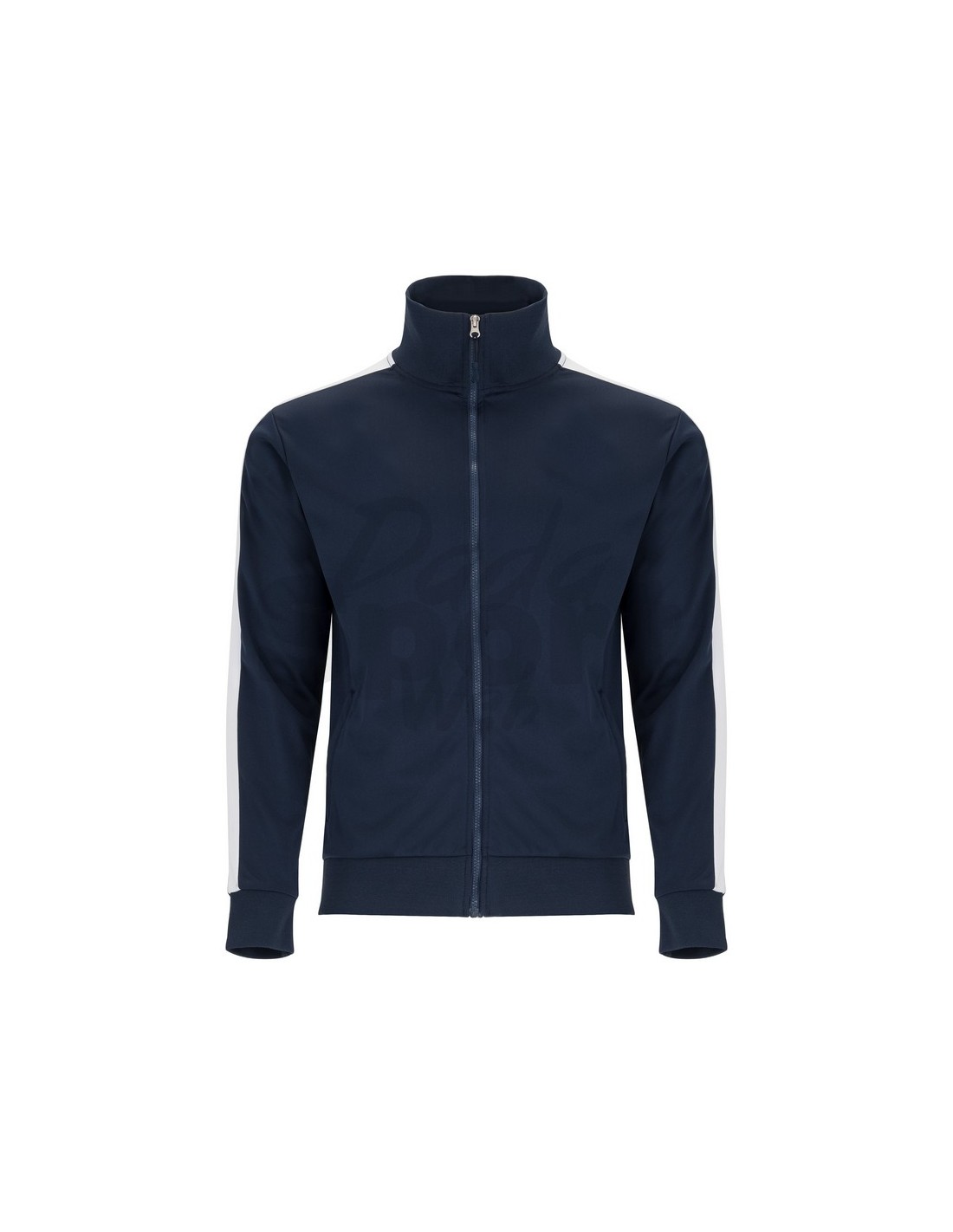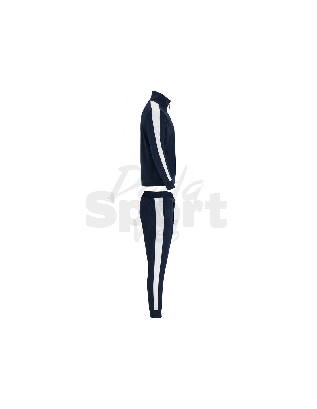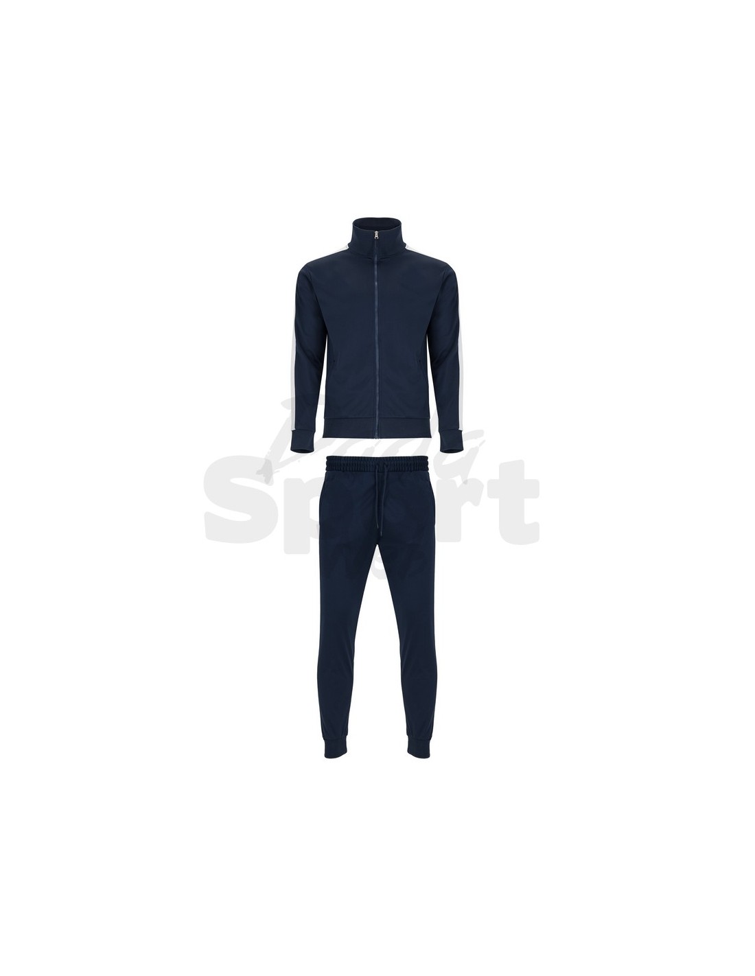Tuta unisex sportiva composta da giacca e pantalone, collo alto con copri cuciture interne in tinta, polsini e girovita in costina 1x1, cerniera centrale in tinta con tiretto, tasche laterali della giacca con cerniera, fascia laterale in contrasto.