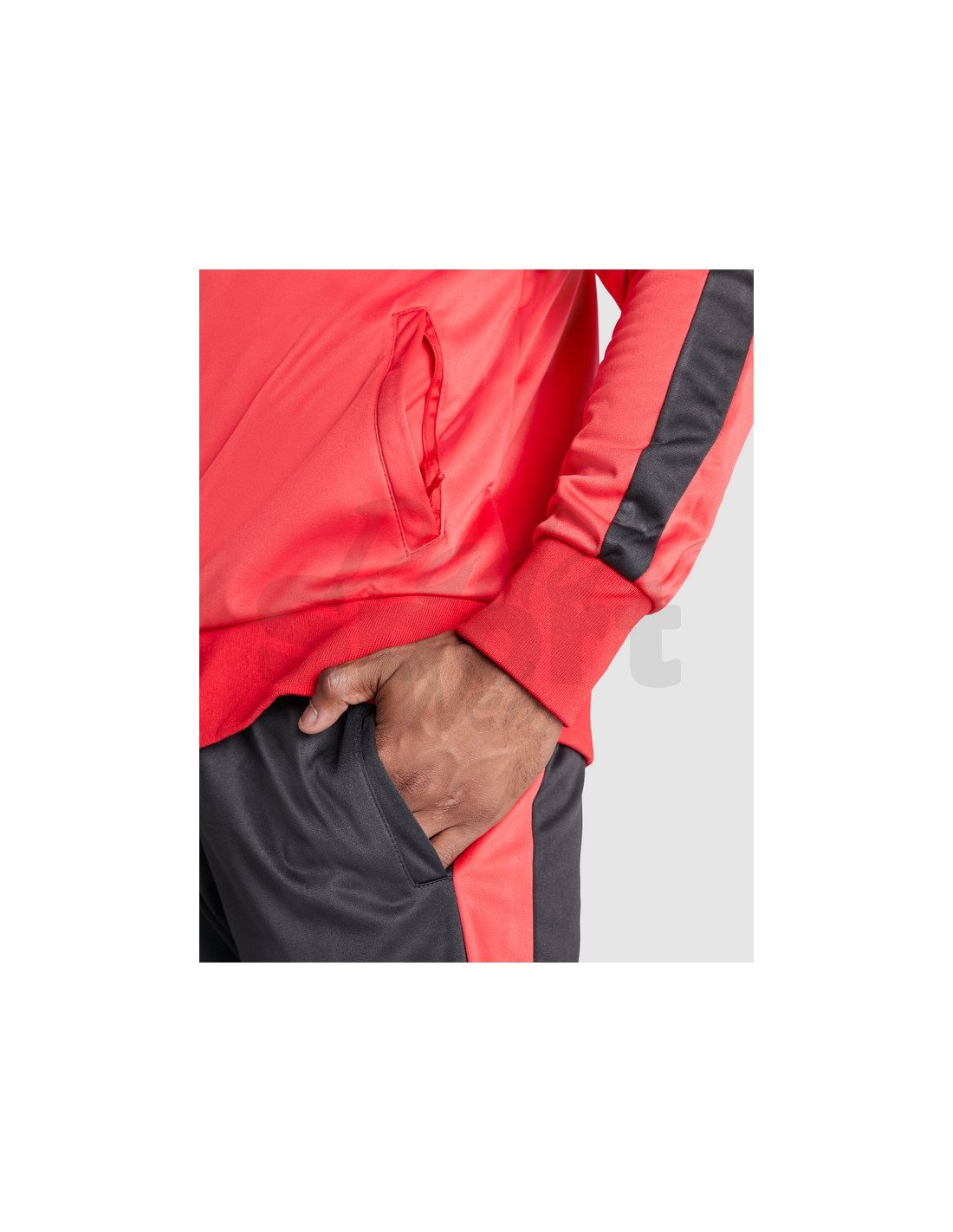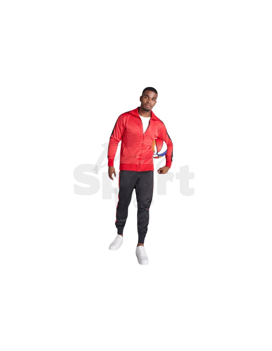 Tuta unisex sportiva composta da giacca e pantalone, collo alto con copri cuciture interne in tinta, polsini e girovita in costina 1x1, cerniera centrale in tinta con tiretto, tasche laterali della giacca con cerniera, fascia laterale in contrasto.