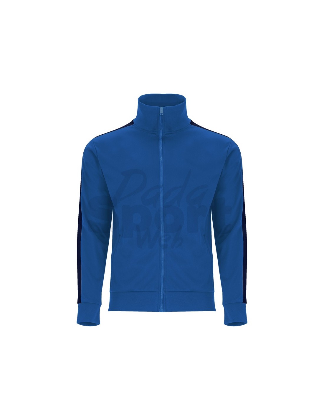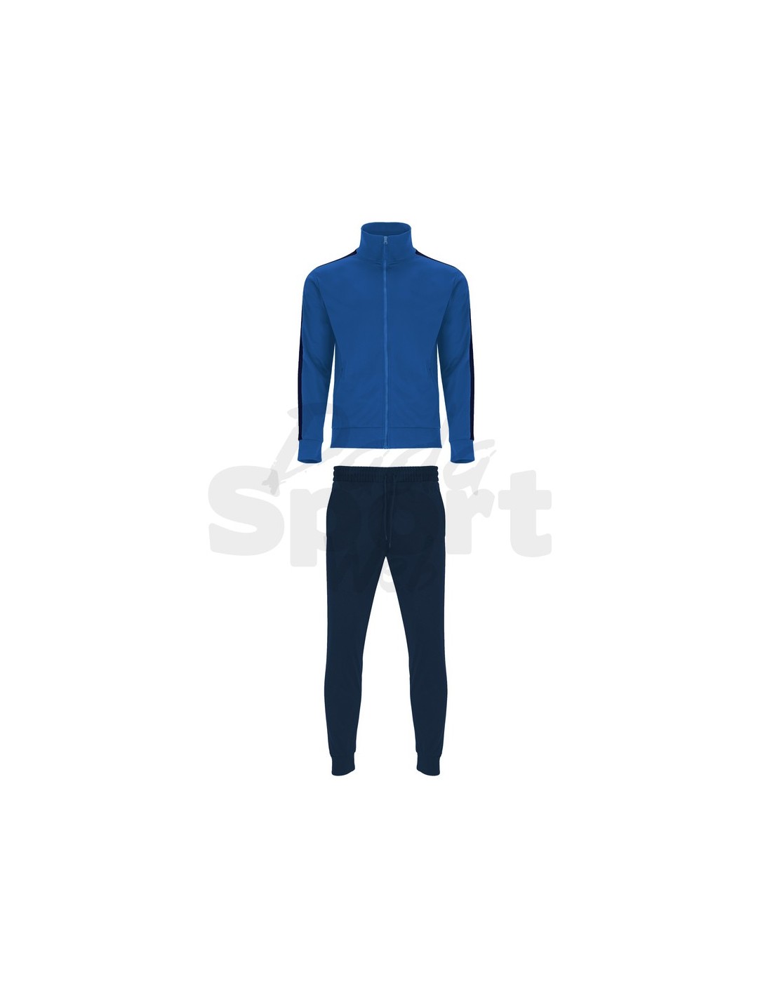 Tuta unisex sportiva composta da giacca e pantalone, collo alto con copri cuciture interne in tinta, polsini e girovita in costina 1x1, cerniera centrale in tinta con tiretto, tasche laterali della giacca con cerniera, fascia laterale in contrasto.