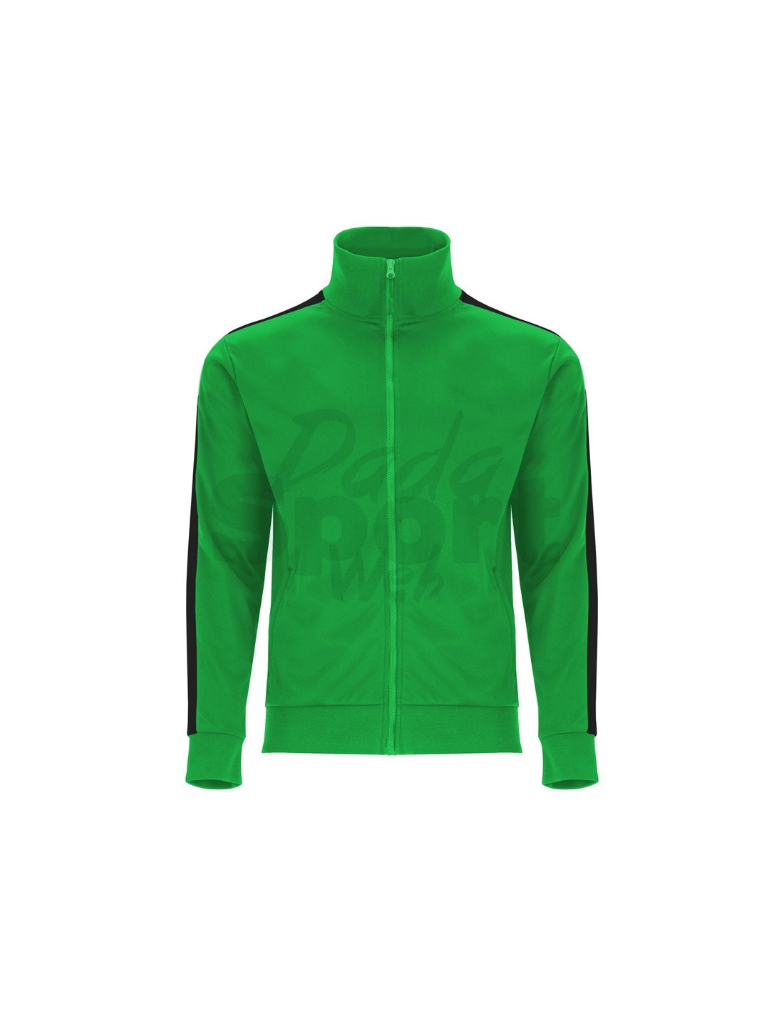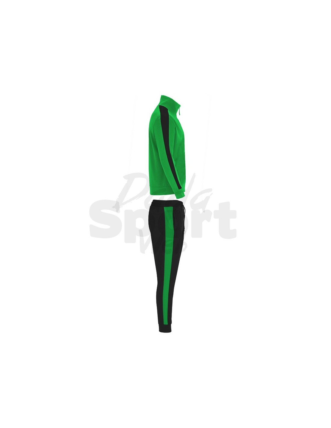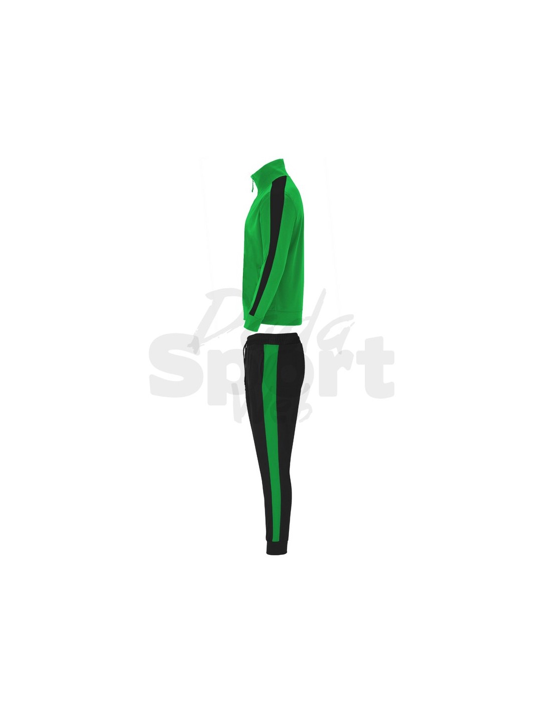 Tuta unisex sportiva composta da giacca e pantalone, collo alto con copri cuciture interne in tinta, polsini e girovita in costina 1x1, cerniera centrale in tinta con tiretto, tasche laterali della giacca con cerniera, fascia laterale in contrasto.
